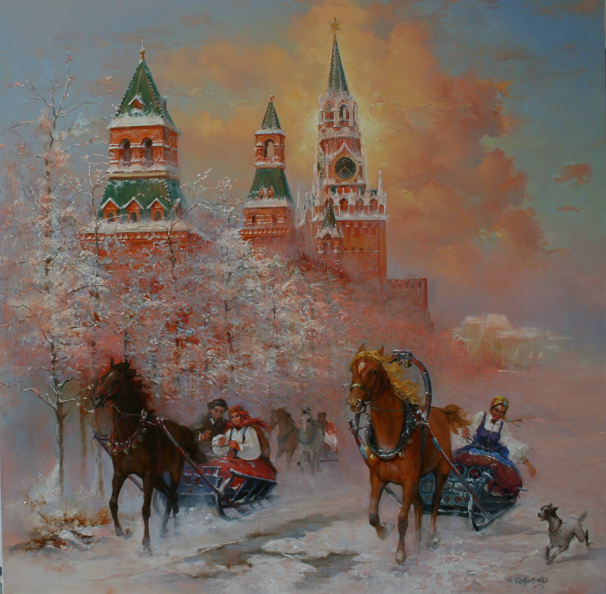 Magnifique Peinture à l’huile Technique de Glacis de l’artiste Français Georges Corominas Troikas 80*80 cm Paysage de Russie Chevaux à découvrir toute l’année à la Galerie Maner de Pont-Aven en Bretagne