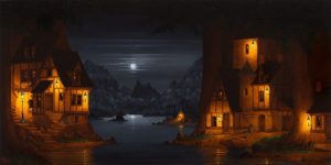 Dans d’autre termes, Il se ressent dans sa peinture la musique qu’il écoute en travaillant, le baroque et Bach principalement. Sa façon de faire cohabiter ces villes éclairées d’une lumière chaude avec des paysages baignés de la lumière froide de la lune. Est à l’image des lignes mélodiques des contrepoints de Bach, faisant naître l’harmonie de mélodies différentes qui se complètent.